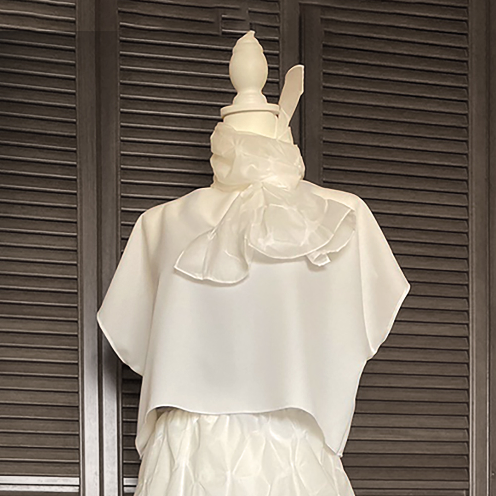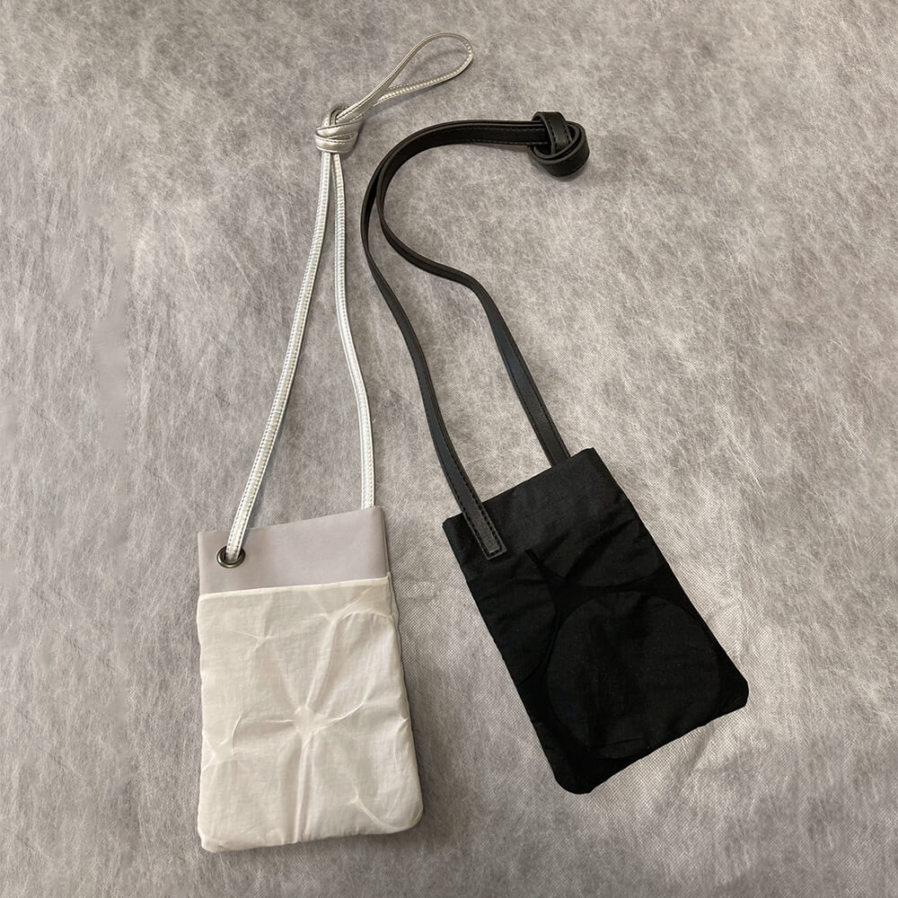 オパール加工ポシェット:黒はシャープな印象にする為、ナイロン素材と重ねてストラップは合皮に。白はライトグレーストレッチ素材と紐はメタリック系シルバーを合わせることで、透明感を出しました。